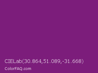 CIELab 30.864,51.089,-31.668 Color is a dark magenta color and the nearest color is Midnight #702670. Hex code #7c1d7b and RGB value is rgb(124,29,123). In RGB color space, this color is composed of 49% red, 11% green, 48% blue, In CMYK color space, this color is composed of 0% cyan, 77% magenta, 1% yellow , 51% black , In HSL color space, this color has a hue angle of 301° , 62% saturation and 30% lightness.