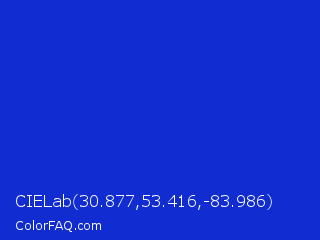 CIELab 30.877,53.416,-83.986 Color is a normal blue color and the nearest color is Persian Blue #1c39bb. Hex code #112dd1 and RGB value is rgb(17,45,209). In RGB color space, this color is composed of 7% red, 18% green, 82% blue, In CMYK color space, this color is composed of 92% cyan, 78% magenta, 0% yellow , 18% black , In HSL color space, this color has a hue angle of 231° , 85% saturation and 44% lightness.