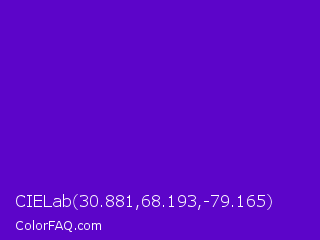 CIELab 30.881,68.193,-79.165 Color is a normal violet color and the nearest color is Interdimensional Blue #360ccc. Hex code #5c05c9 and RGB value is rgb(92,5,201). In RGB color space, this color is composed of 36% red, 2% green, 79% blue, In CMYK color space, this color is composed of 54% cyan, 98% magenta, 0% yellow , 21% black , In HSL color space, this color has a hue angle of 267° , 95% saturation and 40% lightness.