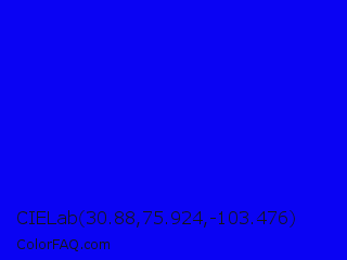 CIELab 30.88,75.924,-103.476 Color is a normal indigo color and the nearest color is Blue #0000ff. Hex code #0a03f3 and RGB value is rgb(10,3,243). In RGB color space, this color is composed of 4% red, 1% green, 95% blue, In CMYK color space, this color is composed of 96% cyan, 99% magenta, 0% yellow , 5% black , In HSL color space, this color has a hue angle of 242° , 98% saturation and 48% lightness.