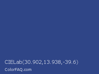 CIELab 30.902,13.938,-39.6 Color is a normal blue color and the nearest color is Chambray #354e8c. Hex code #2f4587 and RGB value is rgb(47,69,135). In RGB color space, this color is composed of 18% red, 27% green, 53% blue, In CMYK color space, this color is composed of 65% cyan, 49% magenta, 0% yellow , 47% black , In HSL color space, this color has a hue angle of 225° , 48% saturation and 36% lightness.
