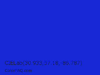 CIELab 30.933,57.18,-86.787 Color is a normal blue color and the nearest color is Palatinate Blue #273be2. Hex code #1729d6 and RGB value is rgb(23,41,214). In RGB color space, this color is composed of 9% red, 16% green, 84% blue, In CMYK color space, this color is composed of 89% cyan, 81% magenta, 0% yellow , 16% black , In HSL color space, this color has a hue angle of 234° , 81% saturation and 46% lightness.