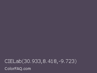 CIELab 30.933,8.418,-9.723 Color is a normal purple color and the nearest color is Mortar #504351. Hex code #4f4558 and RGB value is rgb(79,69,88). In RGB color space, this color is composed of 31% red, 27% green, 35% blue, In CMYK color space, this color is composed of 10% cyan, 22% magenta, 0% yellow , 65% black , In HSL color space, this color has a hue angle of 272° , 12% saturation and 31% lightness.