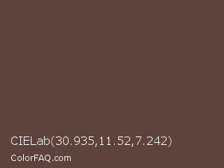 CIELab 30.935,11.52,7.242 Color is a normal red color and the nearest color is Kabul #5e483e. Hex code #5e423e and RGB value is rgb(94,66,62). In RGB color space, this color is composed of 37% red, 26% green, 24% blue, In CMYK color space, this color is composed of 0% cyan, 30% magenta, 34% yellow , 63% black , In HSL color space, this color has a hue angle of 8° , 21% saturation and 31% lightness.