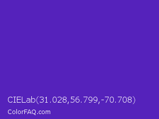 CIELab 31.028,56.799,-70.708 Color is a normal indigo color and the nearest color is Purple Heart Crayola #652dc1. Hex code #5522bb and RGB value is rgb(85,34,187). In RGB color space, this color is composed of 33% red, 13% green, 73% blue, In CMYK color space, this color is composed of 55% cyan, 82% magenta, 0% yellow , 27% black , In HSL color space, this color has a hue angle of 260° , 69% saturation and 43% lightness.