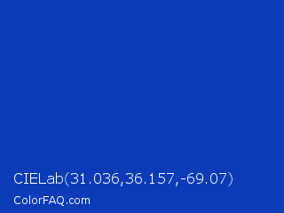 CIELab 31.036,36.157,-69.07 Color is a normal blue color and the nearest color is Persian Blue #1c39bb. Hex code #0c3bb8 and RGB value is rgb(12,59,184). In RGB color space, this color is composed of 5% red, 23% green, 72% blue, In CMYK color space, this color is composed of 93% cyan, 68% magenta, 0% yellow , 28% black , In HSL color space, this color has a hue angle of 224° , 88% saturation and 38% lightness.