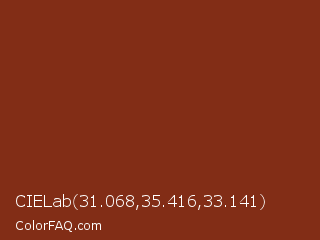 CIELab 31.068,35.416,33.141 Color is a dark red color and the nearest color is Pueblo #7d2c14. Hex code #822d16 and RGB value is rgb(130,45,22). In RGB color space, this color is composed of 51% red, 18% green, 9% blue, In CMYK color space, this color is composed of 0% cyan, 65% magenta, 83% yellow , 49% black , In HSL color space, this color has a hue angle of 13° , 71% saturation and 30% lightness.