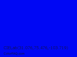CIELab 31.076,75.476,-103.719 Color is a normal blue color and the nearest color is Blue #0000ff. Hex code #0007f4 and RGB value is rgb(0,7,244). In RGB color space, this color is composed of 0% red, 3% green, 96% blue, In CMYK color space, this color is composed of 100% cyan, 97% magenta, 0% yellow , 4% black , In HSL color space, this color has a hue angle of 238° , 100% saturation and 48% lightness.