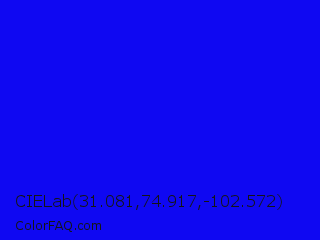 CIELab 31.081,74.917,-102.572 Color is a normal indigo color and the nearest color is Blue #0000ff. Hex code #0f08f2 and RGB value is rgb(15,8,242). In RGB color space, this color is composed of 6% red, 3% green, 95% blue, In CMYK color space, this color is composed of 94% cyan, 97% magenta, 0% yellow , 5% black , In HSL color space, this color has a hue angle of 242° , 94% saturation and 49% lightness.
