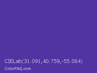 CIELab 31.091,40.759,-55.064 Color is a normal indigo color and the nearest color is Blue Magenta Violet #553592. Hex code #5133a1 and RGB value is rgb(81,51,161). In RGB color space, this color is composed of 32% red, 20% green, 63% blue, In CMYK color space, this color is composed of 50% cyan, 68% magenta, 0% yellow , 37% black , In HSL color space, this color has a hue angle of 256° , 52% saturation and 42% lightness.