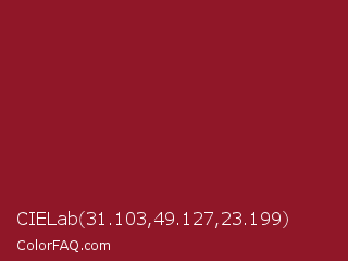 CIELab 31.103,49.127,23.199 Color is a normal red color and the nearest color is Old Brick #901e1e. Hex code #901728 and RGB value is rgb(144,23,40). In RGB color space, this color is composed of 56% red, 9% green, 16% blue, In CMYK color space, this color is composed of 0% cyan, 84% magenta, 72% yellow , 44% black , In HSL color space, this color has a hue angle of 352° , 72% saturation and 33% lightness.