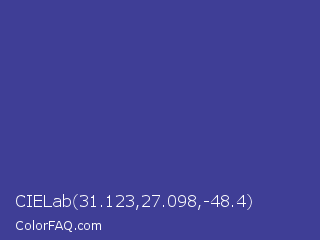 CIELab 31.123,27.098,-48.4 Color is a normal indigo color and the nearest color is Dark Slate Blue #483d8b. Hex code #3f3e96 and RGB value is rgb(63,62,150). In RGB color space, this color is composed of 25% red, 24% green, 59% blue, In CMYK color space, this color is composed of 58% cyan, 59% magenta, 0% yellow , 41% black , In HSL color space, this color has a hue angle of 241° , 42% saturation and 42% lightness.