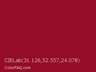 CIELab 31.126,52.557,24.078 Color is a normal red color and the nearest color is Monarch #8b0723. Hex code #940c27 and RGB value is rgb(148,12,39). In RGB color space, this color is composed of 58% red, 5% green, 15% blue, In CMYK color space, this color is composed of 0% cyan, 92% magenta, 74% yellow , 42% black , In HSL color space, this color has a hue angle of 348° , 85% saturation and 31% lightness.