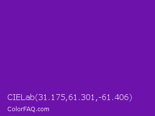 CIELab 31.175,61.301,-61.406 Color is a normal purple color and the nearest color is Grape #6f2da8. Hex code #6e12ac and RGB value is rgb(110,18,172). In RGB color space, this color is composed of 43% red, 7% green, 67% blue, In CMYK color space, this color is composed of 36% cyan, 90% magenta, 0% yellow , 33% black , In HSL color space, this color has a hue angle of 276° , 81% saturation and 37% lightness.