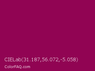 CIELab 31.187,56.072,-5.058 Color is a dark magenta color and the nearest color is Cardinal Pink #8c055e. Hex code #910453 and RGB value is rgb(145,4,83). In RGB color space, this color is composed of 57% red, 2% green, 33% blue, In CMYK color space, this color is composed of 0% cyan, 97% magenta, 43% yellow , 43% black , In HSL color space, this color has a hue angle of 326° , 95% saturation and 29% lightness.