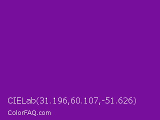 CIELab 31.196,60.107,-51.626 Color is a normal purple color and the nearest color is Seance #731e8f. Hex code #780f9c and RGB value is rgb(120,15,156). In RGB color space, this color is composed of 47% red, 6% green, 61% blue, In CMYK color space, this color is composed of 23% cyan, 90% magenta, 0% yellow , 39% black , In HSL color space, this color has a hue angle of 285° , 82% saturation and 34% lightness.
