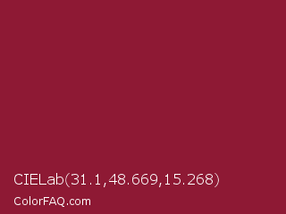 CIELab 31.1,48.669,15.268 Color is a normal red color and the nearest color is Antique Ruby #841b2d. Hex code #8e1934 and RGB value is rgb(142,25,52). In RGB color space, this color is composed of 56% red, 10% green, 20% blue, In CMYK color space, this color is composed of 0% cyan, 82% magenta, 63% yellow , 44% black , In HSL color space, this color has a hue angle of 346° , 70% saturation and 33% lightness.
