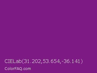 CIELab 31.202,53.654,-36.141 Color is a normal magenta color and the nearest color is Seance #731e8f. Hex code #7d1a83 and RGB value is rgb(125,26,131). In RGB color space, this color is composed of 49% red, 10% green, 51% blue, In CMYK color space, this color is composed of 5% cyan, 80% magenta, 0% yellow , 49% black , In HSL color space, this color has a hue angle of 297° , 67% saturation and 31% lightness.