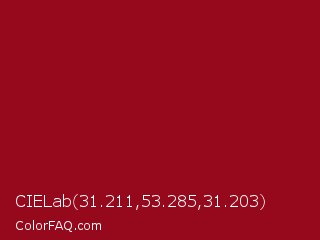 CIELab 31.211,53.285,31.203 Color is a normal red color and the nearest color is Carmine #960018. Hex code #96081c and RGB value is rgb(150,8,28). In RGB color space, this color is composed of 59% red, 3% green, 11% blue, In CMYK color space, this color is composed of 0% cyan, 95% magenta, 81% yellow , 41% black , In HSL color space, this color has a hue angle of 352° , 90% saturation and 31% lightness.