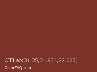 CIELab 31.35,31.934,22.023 Color is a normal red color and the nearest color is Red Robin #80341f. Hex code #7d3229 and RGB value is rgb(125,50,41). In RGB color space, this color is composed of 49% red, 20% green, 16% blue, In CMYK color space, this color is composed of 0% cyan, 60% magenta, 67% yellow , 51% black , In HSL color space, this color has a hue angle of 6° , 51% saturation and 33% lightness.