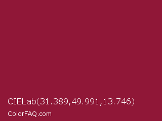 CIELab 31.389,49.991,13.746 Color is a normal rose color and the nearest color is Antique Ruby #841b2d. Hex code #901737 and RGB value is rgb(144,23,55). In RGB color space, this color is composed of 56% red, 9% green, 22% blue, In CMYK color space, this color is composed of 0% cyan, 84% magenta, 62% yellow , 44% black , In HSL color space, this color has a hue angle of 344° , 72% saturation and 33% lightness.