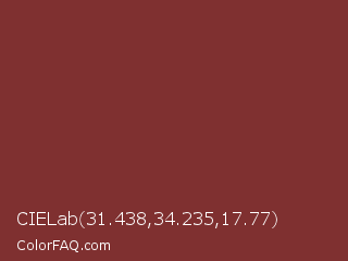CIELab 31.438,34.235,17.77 Color is a normal red color and the nearest color is Wine #722f37. Hex code #7f3030 and RGB value is rgb(127,48,48). In RGB color space, this color is composed of 50% red, 19% green, 19% blue, In CMYK color space, this color is composed of 0% cyan, 62% magenta, 62% yellow , 50% black , In HSL color space, this color has a hue angle of 0° , 45% saturation and 34% lightness.