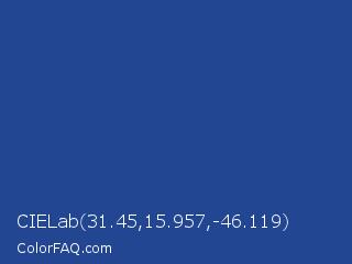 CIELab 31.45,15.957,-46.119 Color is a normal blue color and the nearest color is Sapphire #2f519e. Hex code #234693 and RGB value is rgb(35,70,147). In RGB color space, this color is composed of 14% red, 27% green, 58% blue, In CMYK color space, this color is composed of 76% cyan, 52% magenta, 0% yellow , 42% black , In HSL color space, this color has a hue angle of 221° , 62% saturation and 36% lightness.
