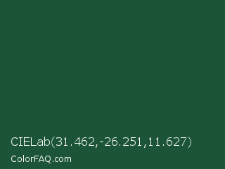 CIELab 31.462,-26.251,11.627 Color is a very dark green color and the nearest color is Brunswick Green #1b4d3e. Hex code #1b5437 and RGB value is rgb(27,84,55). In RGB color space, this color is composed of 11% red, 33% green, 22% blue, In CMYK color space, this color is composed of 68% cyan, 0% magenta, 35% yellow , 67% black , In HSL color space, this color has a hue angle of 149° , 51% saturation and 22% lightness.