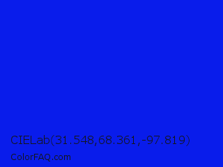 CIELab 31.548,68.361,-97.819 Color is a normal blue color and the nearest color is Bluebonnet #1c1cf0. Hex code #091ceb and RGB value is rgb(9,28,235). In RGB color space, this color is composed of 4% red, 11% green, 92% blue, In CMYK color space, this color is composed of 96% cyan, 88% magenta, 0% yellow , 8% black , In HSL color space, this color has a hue angle of 235° , 93% saturation and 48% lightness.