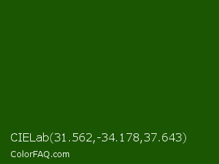 CIELab 31.562,-34.178,37.643 Color is a very dark green color and the nearest color is Lincoln Green #195905. Hex code #1b5602 and RGB value is rgb(27,86,2). In RGB color space, this color is composed of 11% red, 34% green, 1% blue, In CMYK color space, this color is composed of 69% cyan, 0% magenta, 98% yellow , 66% black , In HSL color space, this color has a hue angle of 102° , 95% saturation and 17% lightness.