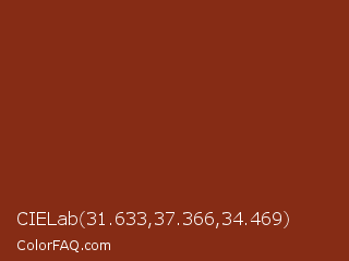 CIELab 31.633,37.366,34.469 Color is a dark red color and the nearest color is Kobe #882d17. Hex code #862c15 and RGB value is rgb(134,44,21). In RGB color space, this color is composed of 53% red, 17% green, 8% blue, In CMYK color space, this color is composed of 0% cyan, 67% magenta, 84% yellow , 47% black , In HSL color space, this color has a hue angle of 12° , 73% saturation and 30% lightness.