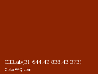CIELab 31.644,42.838,43.373 Color is a dark color and the nearest color is Totem Pole #991b07. Hex code #8d2402 and RGB value is rgb(141,36,2). In RGB color space, this color is composed of 55% red, 14% green, 1% blue, In CMYK color space, this color is composed of 0% cyan, 74% magenta, 99% yellow , 45% black , In HSL color space, this color has a hue angle of 15° , 97% saturation and 28% lightness.