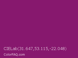 CIELab 31.647,53.115,-22.048 Color is a normal magenta color and the nearest color is Cardinal Pink #8c055e. Hex code #87186e and RGB value is rgb(135,24,110). In RGB color space, this color is composed of 53% red, 9% green, 43% blue, In CMYK color space, this color is composed of 0% cyan, 82% magenta, 19% yellow , 47% black , In HSL color space, this color has a hue angle of 314° , 70% saturation and 31% lightness.