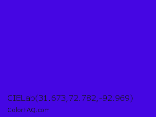 CIELab 31.673,72.782,-92.969 Color is a normal indigo color and the nearest color is Interdimensional Blue #360ccc. Hex code #4506e3 and RGB value is rgb(69,6,227). In RGB color space, this color is composed of 27% red, 2% green, 89% blue, In CMYK color space, this color is composed of 70% cyan, 97% magenta, 0% yellow , 11% black , In HSL color space, this color has a hue angle of 257° , 95% saturation and 46% lightness.