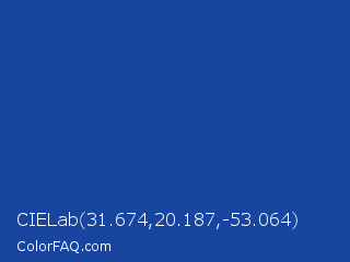 CIELab 31.674,20.187,-53.064 Color is a normal blue color and the nearest color is Tory Blue #1450aa. Hex code #17459f and RGB value is rgb(23,69,159). In RGB color space, this color is composed of 9% red, 27% green, 62% blue, In CMYK color space, this color is composed of 86% cyan, 57% magenta, 0% yellow , 38% black , In HSL color space, this color has a hue angle of 220° , 75% saturation and 36% lightness.