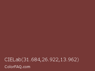 CIELab 31.684,26.922,13.962 Color is a normal red color and the nearest color is Wine #722f37. Hex code #763836 and RGB value is rgb(118,56,54). In RGB color space, this color is composed of 46% red, 22% green, 21% blue, In CMYK color space, this color is composed of 0% cyan, 53% magenta, 54% yellow , 54% black , In HSL color space, this color has a hue angle of 2° , 37% saturation and 34% lightness.