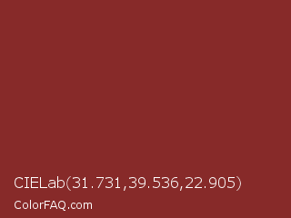 CIELab 31.731,39.536,22.905 Color is a normal red color and the nearest color is Burnt Umber #8a3324. Hex code #872a29 and RGB value is rgb(135,42,41). In RGB color space, this color is composed of 53% red, 16% green, 16% blue, In CMYK color space, this color is composed of 0% cyan, 69% magenta, 70% yellow , 47% black , In HSL color space, this color has a hue angle of 1° , 53% saturation and 35% lightness.