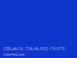 CIELab 31.734,46.923,-79.075 Color is a normal blue color and the nearest color is Persian Blue #1c39bb. Hex code #1035cb and RGB value is rgb(16,53,203). In RGB color space, this color is composed of 6% red, 21% green, 80% blue, In CMYK color space, this color is composed of 92% cyan, 74% magenta, 0% yellow , 20% black , In HSL color space, this color has a hue angle of 228° , 85% saturation and 43% lightness.