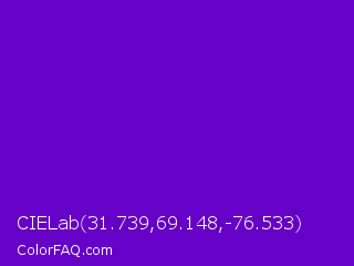 CIELab 31.739,69.148,-76.533 Color is a normal purple color and the nearest color is French Violet #8806ce. Hex code #6601c7 and RGB value is rgb(102,1,199). In RGB color space, this color is composed of 40% red, 0% green, 78% blue, In CMYK color space, this color is composed of 49% cyan, 99% magenta, 0% yellow , 22% black , In HSL color space, this color has a hue angle of 271° , 99% saturation and 39% lightness.