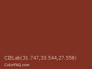 CIELab 31.747,33.544,27.558 Color is a normal red color and the nearest color is Red Robin #80341f. Hex code #813121 and RGB value is rgb(129,49,33). In RGB color space, this color is composed of 51% red, 19% green, 13% blue, In CMYK color space, this color is composed of 0% cyan, 62% magenta, 74% yellow , 49% black , In HSL color space, this color has a hue angle of 10° , 59% saturation and 32% lightness.