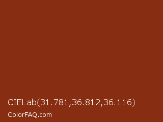 CIELab 31.781,36.812,36.116 Color is a dark red color and the nearest color is Kobe #882d17. Hex code #862d12 and RGB value is rgb(134,45,18). In RGB color space, this color is composed of 53% red, 18% green, 7% blue, In CMYK color space, this color is composed of 0% cyan, 66% magenta, 87% yellow , 47% black , In HSL color space, this color has a hue angle of 14° , 76% saturation and 30% lightness.