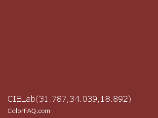 CIELab 31.787,34.039,18.892 Color is a normal red color and the nearest color is Burnt Umber #8a3324. Hex code #80312f and RGB value is rgb(128,49,47). In RGB color space, this color is composed of 50% red, 19% green, 18% blue, In CMYK color space, this color is composed of 0% cyan, 62% magenta, 63% yellow , 50% black , In HSL color space, this color has a hue angle of 1° , 46% saturation and 34% lightness.