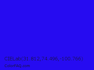 CIELab 31.812,74.496,-100.766 Color is a normal indigo color and the nearest color is Bluebonnet #1c1cf0. Hex code #260bf1 and RGB value is rgb(38,11,241). In RGB color space, this color is composed of 15% red, 4% green, 95% blue, In CMYK color space, this color is composed of 84% cyan, 95% magenta, 0% yellow , 5% black , In HSL color space, this color has a hue angle of 247° , 91% saturation and 49% lightness.