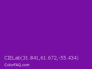 CIELab 31.841,61.672,-55.434 Color is a normal purple color and the nearest color is Violet RYB #8601af. Hex code #780fa4 and RGB value is rgb(120,15,164). In RGB color space, this color is composed of 47% red, 6% green, 64% blue, In CMYK color space, this color is composed of 27% cyan, 91% magenta, 0% yellow , 36% black , In HSL color space, this color has a hue angle of 282° , 83% saturation and 35% lightness.
