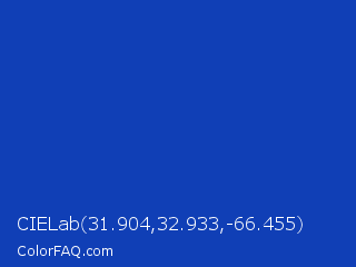 CIELab 31.904,32.933,-66.455 Color is a normal blue color and the nearest color is Persian Blue #1c39bb. Hex code #103fb6 and RGB value is rgb(16,63,182). In RGB color space, this color is composed of 6% red, 25% green, 71% blue, In CMYK color space, this color is composed of 91% cyan, 65% magenta, 0% yellow , 29% black , In HSL color space, this color has a hue angle of 223° , 84% saturation and 39% lightness.