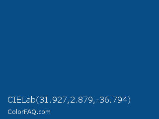 CIELab 31.927,2.879,-36.794 Color is a dark blue color and the nearest color is Dark Cerulean #08457e. Hex code #084d85 and RGB value is rgb(8,77,133). In RGB color space, this color is composed of 3% red, 30% green, 52% blue, In CMYK color space, this color is composed of 94% cyan, 42% magenta, 0% yellow , 48% black , In HSL color space, this color has a hue angle of 207° , 89% saturation and 28% lightness.
