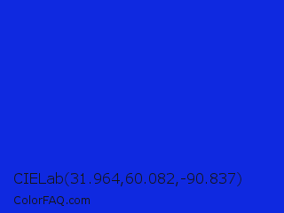 CIELab 31.964,60.082,-90.837 Color is a normal blue color and the nearest color is Bluebonnet #1c1cf0. Hex code #0f29e0 and RGB value is rgb(15,41,224). In RGB color space, this color is composed of 6% red, 16% green, 88% blue, In CMYK color space, this color is composed of 93% cyan, 82% magenta, 0% yellow , 12% black , In HSL color space, this color has a hue angle of 233° , 87% saturation and 47% lightness.
