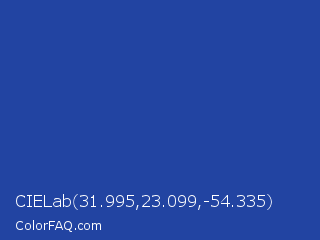 CIELab 31.995,23.099,-54.335 Color is a normal blue color and the nearest color is Sapphire #2f519e. Hex code #2244a2 and RGB value is rgb(34,68,162). In RGB color space, this color is composed of 13% red, 27% green, 64% blue, In CMYK color space, this color is composed of 79% cyan, 58% magenta, 0% yellow , 36% black , In HSL color space, this color has a hue angle of 224° , 65% saturation and 38% lightness.