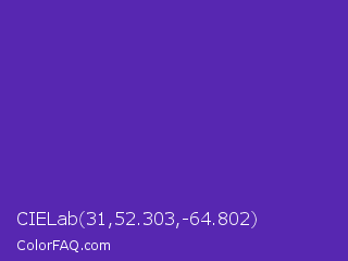 CIELab 31,52.303,-64.802 Color is a normal violet color and the nearest color is Purple Heart Crayola #652dc1. Hex code #5727b1 and RGB value is rgb(87,39,177). In RGB color space, this color is composed of 34% red, 15% green, 69% blue, In CMYK color space, this color is composed of 51% cyan, 78% magenta, 0% yellow , 31% black , In HSL color space, this color has a hue angle of 261° , 64% saturation and 42% lightness.