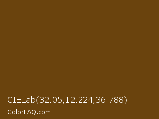 CIELab 32.05,12.224,36.788 Color is a dark orange color and the nearest color is Cafe Royale #6f440c. Hex code #6a430d and RGB value is rgb(106,67,13). In RGB color space, this color is composed of 42% red, 26% green, 5% blue, In CMYK color space, this color is composed of 0% cyan, 37% magenta, 88% yellow , 58% black , In HSL color space, this color has a hue angle of 35° , 78% saturation and 23% lightness.